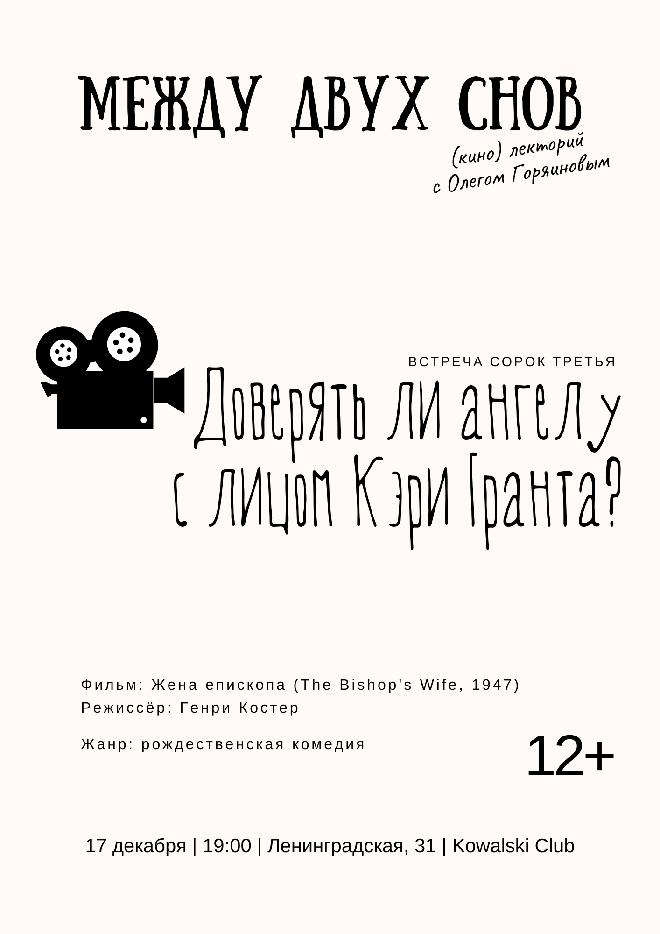 На очередной встрече кинолектория «Между двух снов» смотрим нравоучительную историю с праздничным привкусом и ищем ответ на вопрос: действительно ли бывают ангелы, похожие на Кэри Гранта, а если бывают, то как вести себя при встрече с ними?