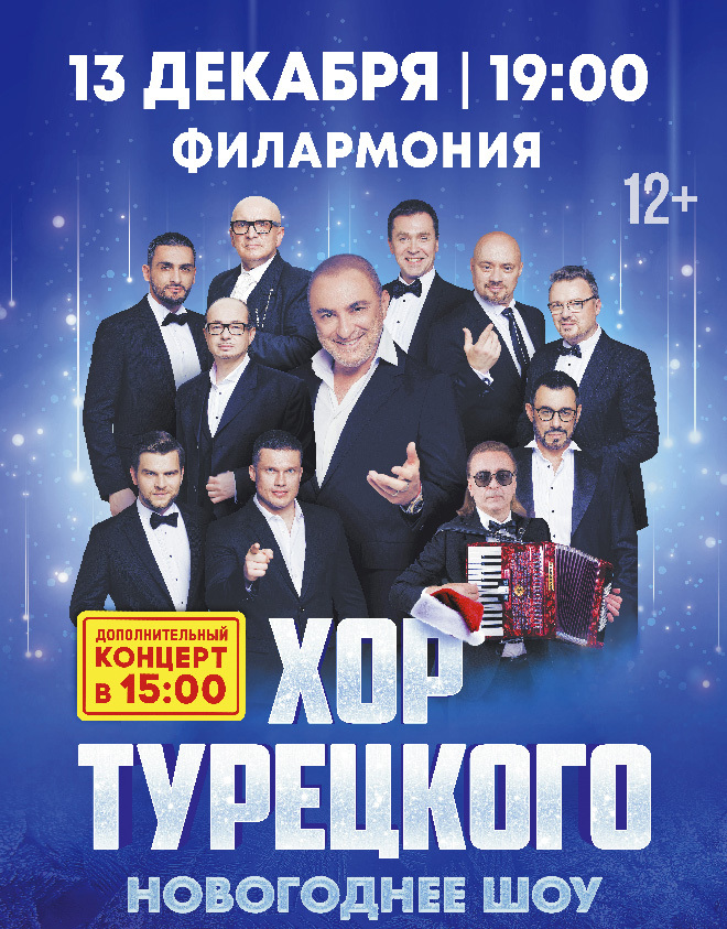 Именитые мастера вокала Хор Турецкого представят фееричное Новогоднее шоу! Прозвучат лучшие песни из мировой коллекции новогодних и рождественских хитов в эксклюзивных аранжировках, полюбившиеся авторские композиции и горячие новинки! Феноменальные голоса от баса-профундо до мужского сопрано, яркая харизма исполнителей, невероятная энергетика, яркие спецэффекты и волшебство на сцене подарят хорошее настроение на весь наступающий год! Зрители погрузятся в настоящую музыкальную сказку, а желания, загаданные под любимую музыку, обязательно сбудутся!