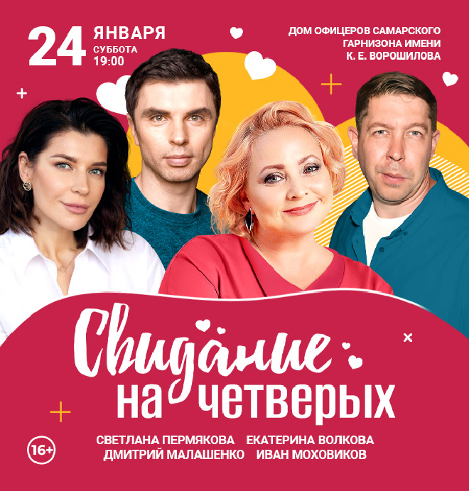 В уморительной комедии «Свидание на четверых» нелётная погода становится началом череды смешных и трогательных событий! В гостинице провинциального города встречаются пассажиры самолета, которые не смогли вылететь из-за плохой погоды. Столичная бизнес-леди Марина решает провести ночь с любовником Артемом, успев вернуть его после прощания. Однако ее планы рушатся, когда в номер неожиданно подселяется Зоя, деревенская женщина с простым нравом, которая не собирается учитывать чужие интересы. Позже к ним присоединяется ревнивый муж Зои. Каждый герой со своими эмоциями, секретами и желаниями. Эта ночь перевернет их жизни…