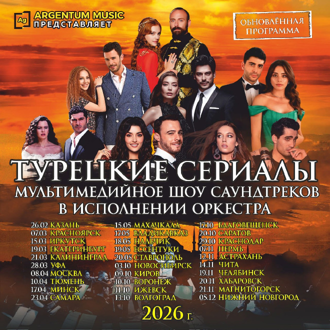 Не упустите шанс окунуться в мир, где любовь сильнее ненависти, а верность – дороже золота. Это шоу – идеальный способ провести вечер в компании любимых мелодий и ощутить себя частью захватывающей турецкой киносаги. В программе не только любимая классика: «Великолепный век», «Королёк-птичка певчая», «Черная любовь», «Чукур», но и современные новинки: «Зимородок», «Клюквенный щербет», «Правосудие», «Далекий город», «Семья» и др.