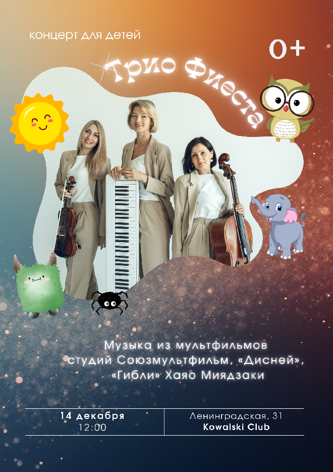 Во время всего путешествия в страну мультипликации будет звучать музыка в исполнении трио «Фиеста». Звуки виолончели, скрипки и фортепиано помогут перенестись в мир волшебства и сказки.