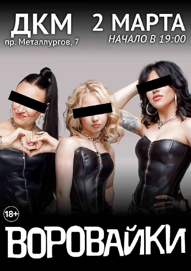 Встречайте в Вашем городе невероятное, зажигательное, уже полюбившееся всей стране ураганное трио! Новое поколение супер-популярной группы "Воровайки"! В концертной программе прозвучат самые любимые хиты («Хоп, мусорок», «Наколочки», «Не воровка, не шалава», «Девчонка рыжая» и другие) и конечно же новые песни! "Воровайки" в Вашем городе! Такое событие нельзя пропустить!