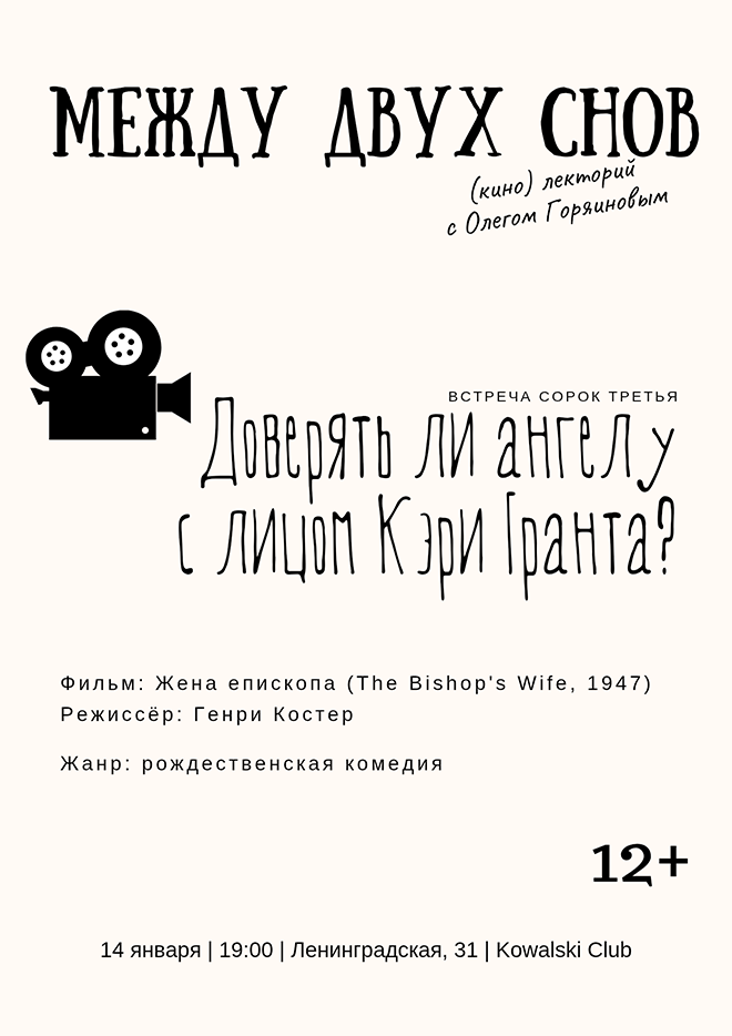 На очередной встрече кинолектория «Между двух снов» смотрим нравоучительную историю с праздничным привкусом и ищем ответ на вопрос: действительно ли бывают ангелы, похожие на Кэри Гранта, а если бывают, то как вести себя при встрече с ними?