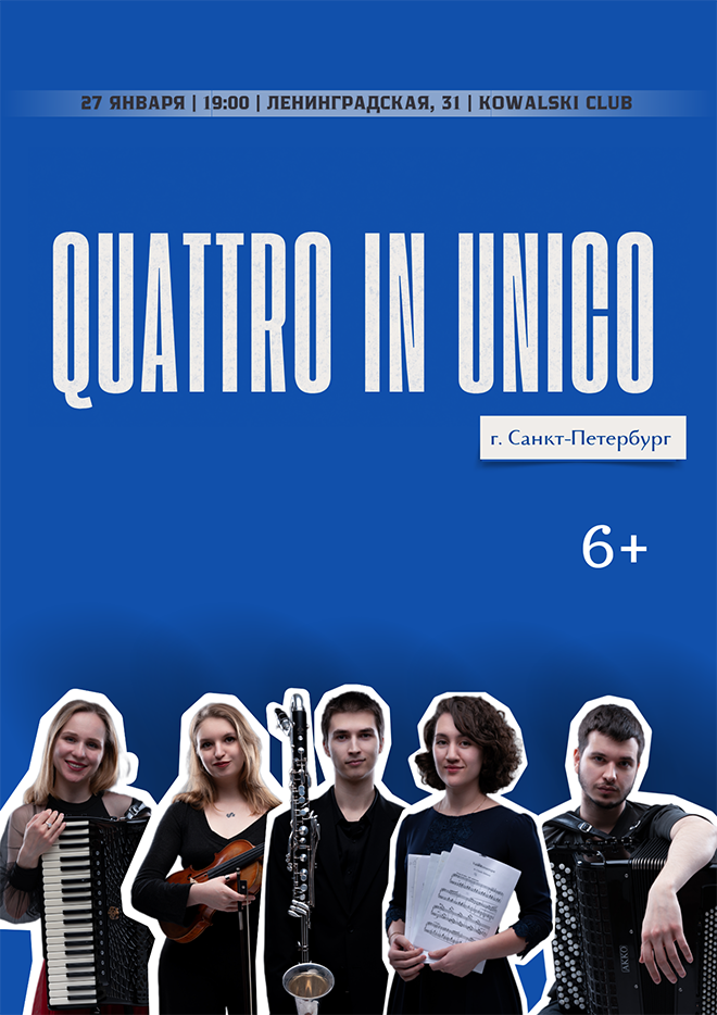 Ансамбль Quattro in Unico - коллектив с неповторимым составом: скрипка, бас-кларнет, аккордеон и фортепиано. В музыкальной природе эти инструменты встречаются вместе достаточно редко, что делает квартет поистине особенным и уникальным.