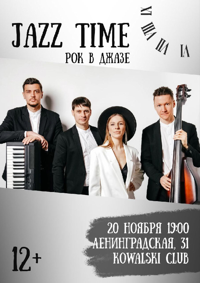 В этот вечер настроение гостям создаст квартет Jazz Time. В музыкальной программе «Рок хит под джазовый бит» можно будет послушать не только традиционный джаз, но также популярные композиции, рок-хиты в авторском, джазовом прочтении коллектива.