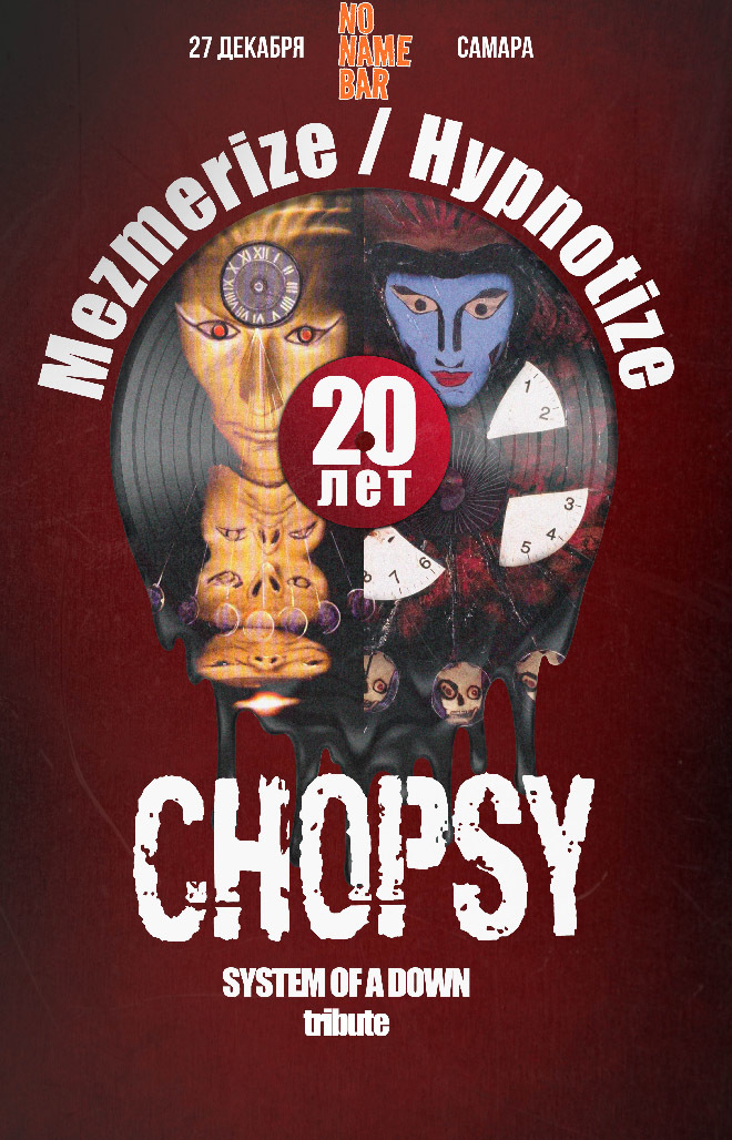 Зубодробительные риффы, бешеная энергия великих System of a Down! Столичный коллектив CHOPSY Band приглашает вас отпраздновать 20-летие Hypnotize и Mezmerize вместе с нами! В программе любимые песни из последних двух альбомов Системы, а также культовые хиты группы, объединившие слушателей со всех континентов. Исполнение пропитано драйвом и грувом оригинала, исполнители - профессиональные музыканты мирового уровня. Не пропустите легендарное шоу в вашем городе!