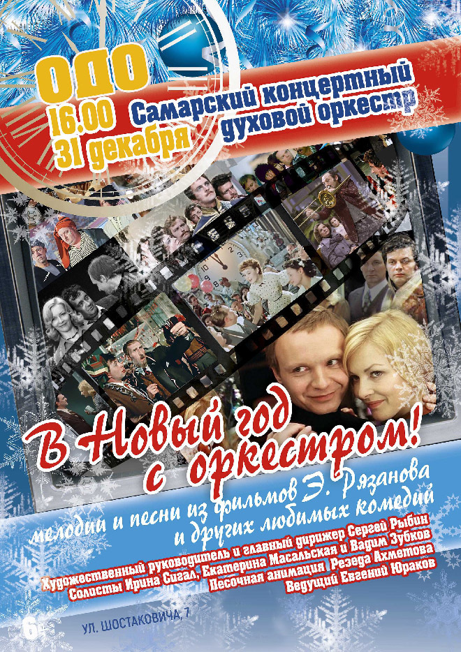У главной новогодней ёлки Самарской губернии, Новогодняя концертная программа Самарского концертного духового оркестра «В новый год с оркестром», посвящённая 50-летию выхода на экран символа нового года, культового новогоднего фильма «Ирония судьбы или с легким паром», режиссера Эльдара Александровича Рязанова. В концертной программе прозвучат песни и музыка из фильма «Ирония судьбы или с легким паром» и других фильмов Э. Рязанова на музыку М. Таривердиева, А. Петрова, А. Лепина, а также музыка из любимых новогодних комедий. Вместе с оркестром выступят солисты Екатерина Масальская, Ирина Сигал и Вадим Зубков. Песочная анимация от Резеды Ахметовой, и блестящий конферанс от Евгения Юракова. В фойе перед концертом вас ждет новогодняя елка и встреча с Дедушкой Морозом!