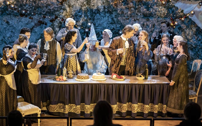 Рождественский сочельник. Часы возвещают время чаепития. Все отправляются в столовую. Отец исполняет арию Зарастро. Все в восторге. Бьют часы. Все спешат переодеться, чтобы продолжить спектакль. Лакеи подшучивают над дворецким, предостерегая его от чрезмерного увлечения женским полом. Спектакль продолжается.