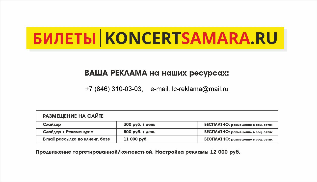 Размещение блока на афише каждого мероприятия предварительно (до отправки афиш в печать) согласовывается с администрацией Koncertsamara.ru.